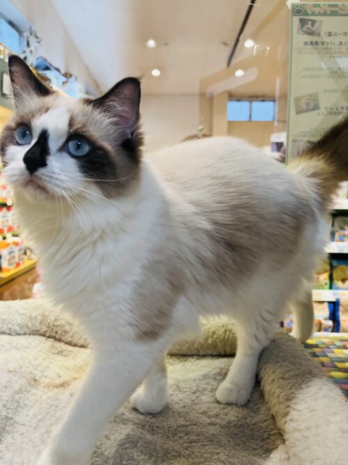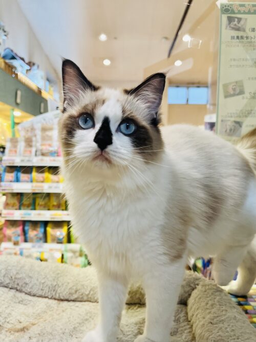 穏やかで人好きな性格のラグドールの女の子♪ 整ったお顔立ちの美猫ちゃんです(*´ω`)💞 英語で『ぬいぐるみ人形』を意味する『ラグ・ドール』がこの品種の名前の由来らしいですよ! お鼻の模様が雫💧のようにも見えませんか?👀
